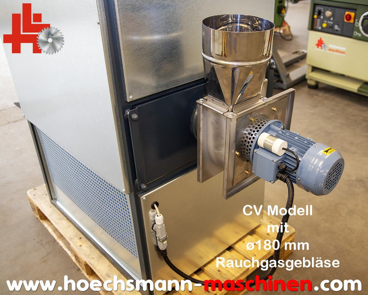 erfüllt die aktuelle BImSchV als Einzelraumfeuerungsanlage, Heizleistung 49 kW, empfohlen für Raumvolumen bis 1.000 m³, 3.500 m³/h Warmluftförderung, 2 schwenkbare Ausblasöffnungen aus poliertem Edelstahl Ø= 200 mm, die Lufteinlässe rechts und links sind mit 2 wechselbaren Filtereinheiten zum Filtern der Ansaugluft ausgestattet, elektronische Steuerung des Warmluftgebläses mit Thermostat und Steuerpult, akustische und optische Warnung bei Überhitzung, inkl. Rauchgasgebläse mit Ø= 180 mm Kaminanschluss, Brennraummaße BxTxH 480 x 660 x 600 mm aus Chromstahl, Brennstoffverbrauch je nach Material ca. 20 kg/h, max. Lärmpegel 60 dB, Transportmaße ohne Palette: Höhe 1.750 x Breite 700 x Tiefe 1.150 mm, Gewicht 305 kg,