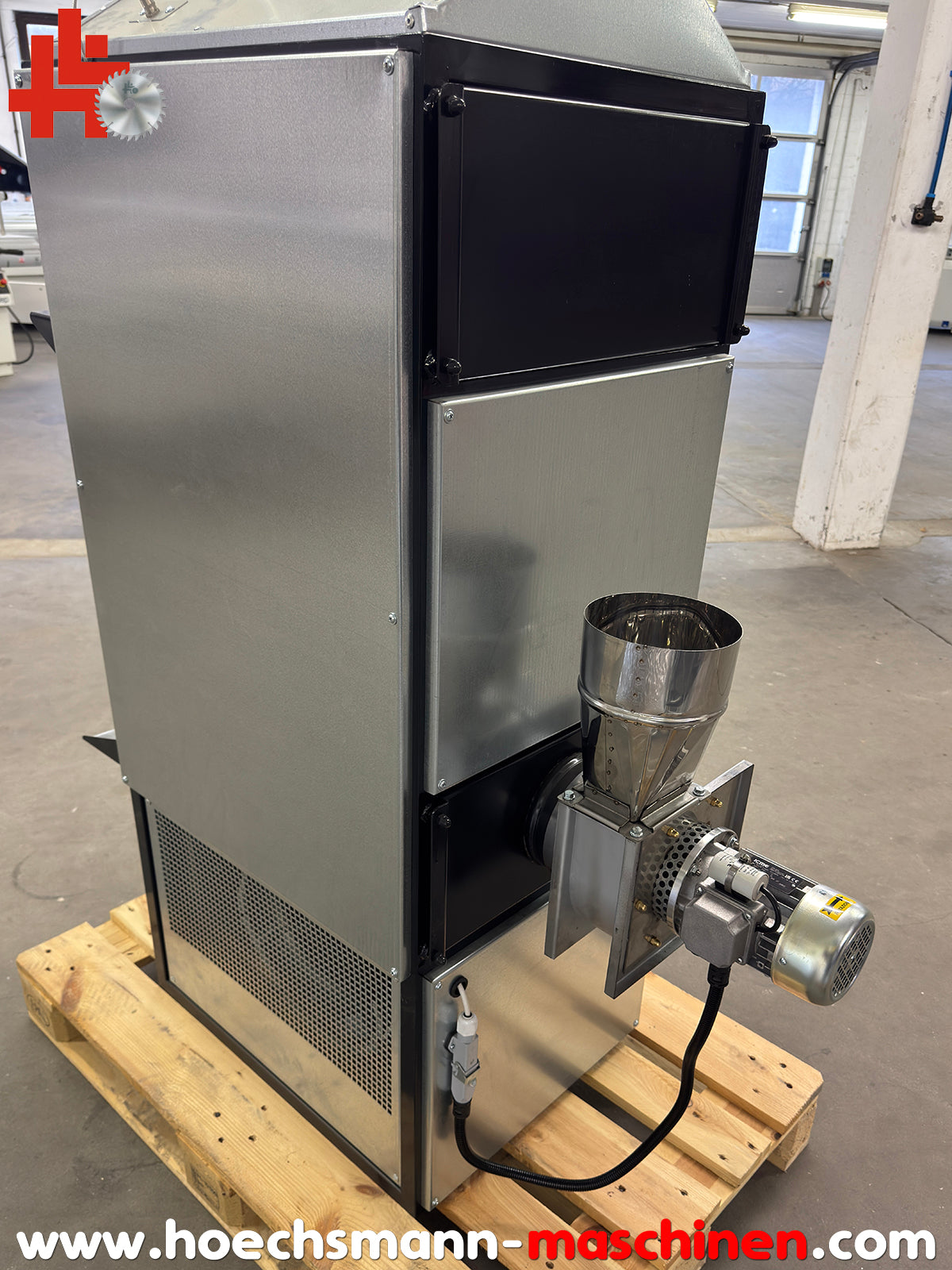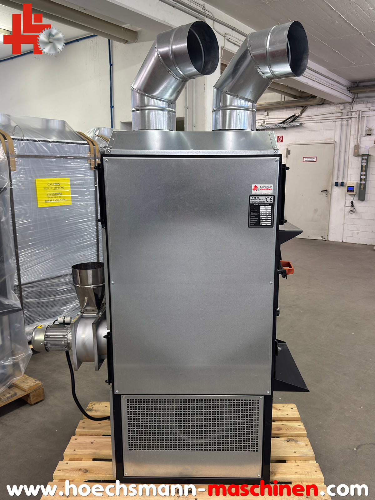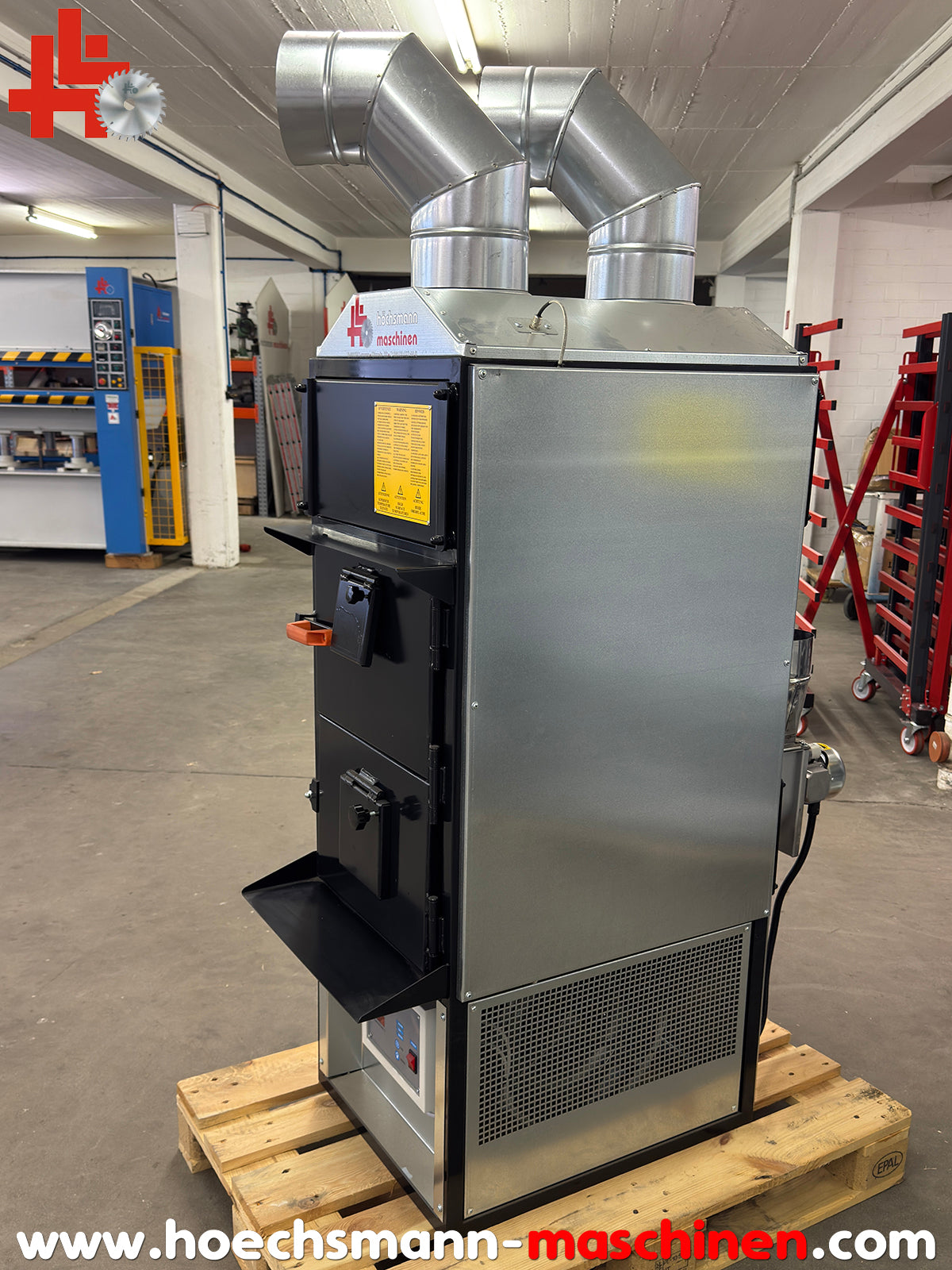 CE Zeichen, erfüllt aktuelle BImSchV als Einzelraumfeuerungsanlage, Heizleistung 34 kW, empfohlen für Raumvolumen bis 500 m³, 2.200 m³/h Warmluftförderung, 2 schwenkbare Ausblasöffnungen Ø= 180 mm, elektronische Steuerung des Warmluftgebläses mit Thermostat und Steuerpult, akustische und optische Warnung bei Überhitzung, inklusive Rauchgasgebläse mit Ø= 160 mm Kaminrohranschluss, Brennraummaße BxTxH 400 x 500 x 590 mm aus Chromstahl, Brennstoffverbrauch je nach Material ca. 13-15 kg/h, Lärmpegel 60 DB, Transportmaße ohne Palette: Höhe 1.560 x Breite 550 x Tiefe 920 mm, Gewicht 190 kg